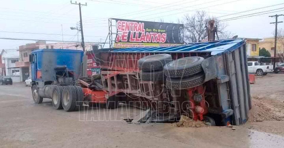 Vuelca contenedor de tráiler cargado con caliche en Río Bravo