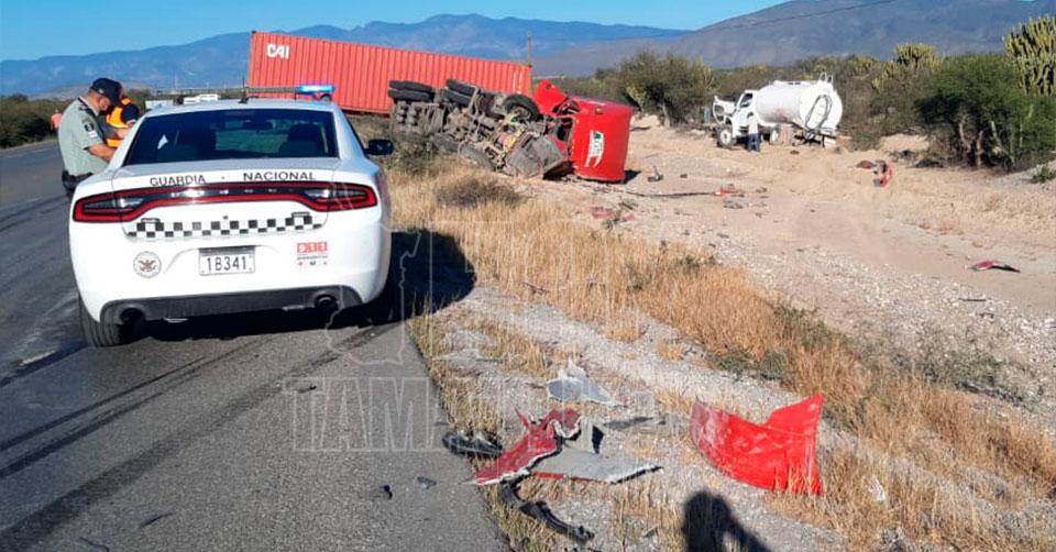 Choque-volcadura entre pipa y tráiler deja tres lesionados en Tula