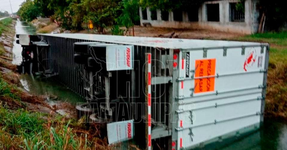 Vuelca tráiler cargado con harina y cae a canal en Xicoténcatl
