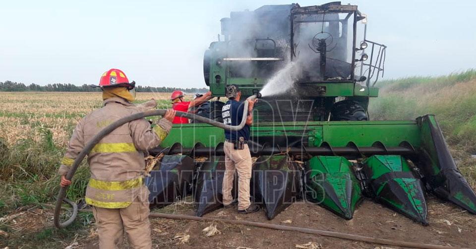 Se incendia trilladora Jhon Deere en parcela de Camargo, Tamaulipas