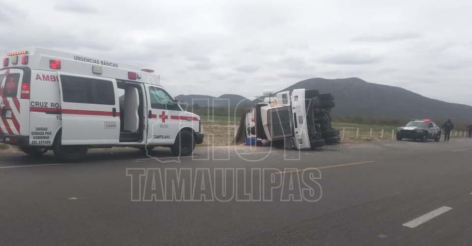 Vuelca tracto camión que transportaba tierra en Tula, Tamaulipas