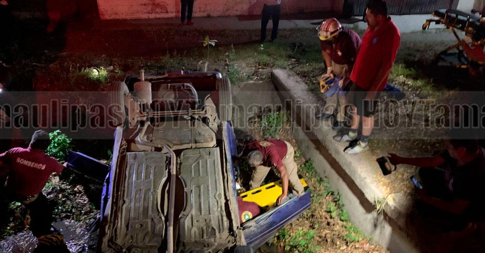 Conductor atrapado en su vehículo al volcar en desagüe en El Mante