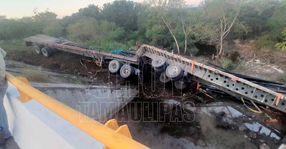 Tráiler se sale de la carretera tras pasar socavón en Soto la Marina