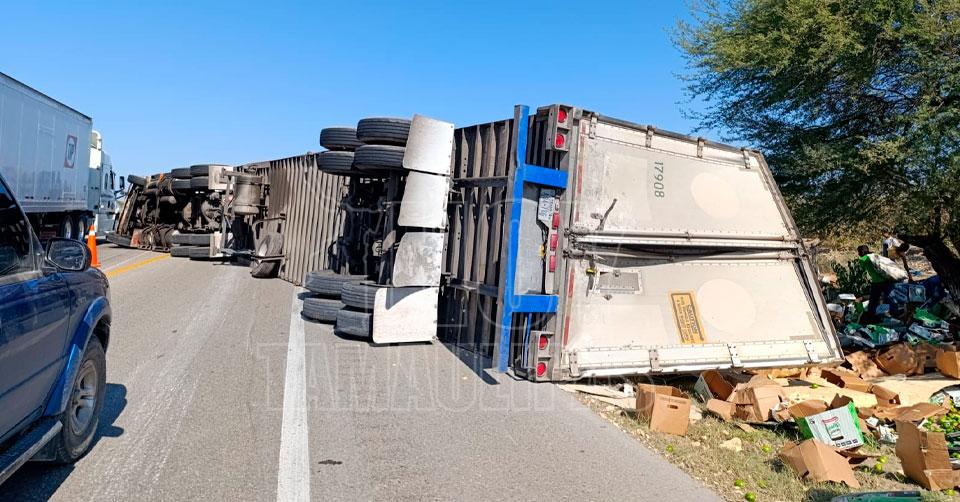 Vuelca tráiler cargado con limón en la carretera González-Llera; hay rapiña