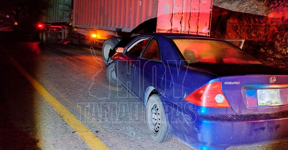 Destroza frente de su auto tras estrellarse contra caja de tráiler en la Tula-Victoria