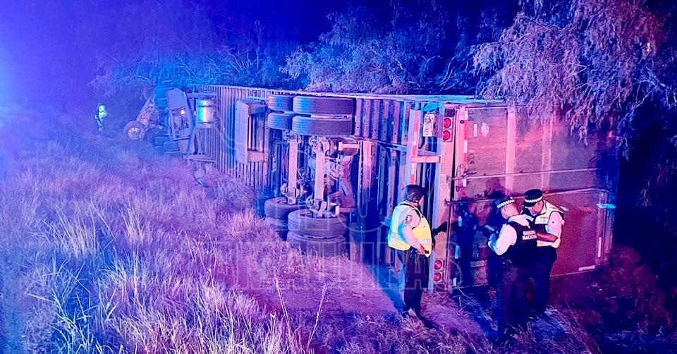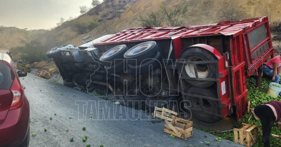 Vuelca camión con carga de tomatillo en la carretera Jaumave-Victoria
