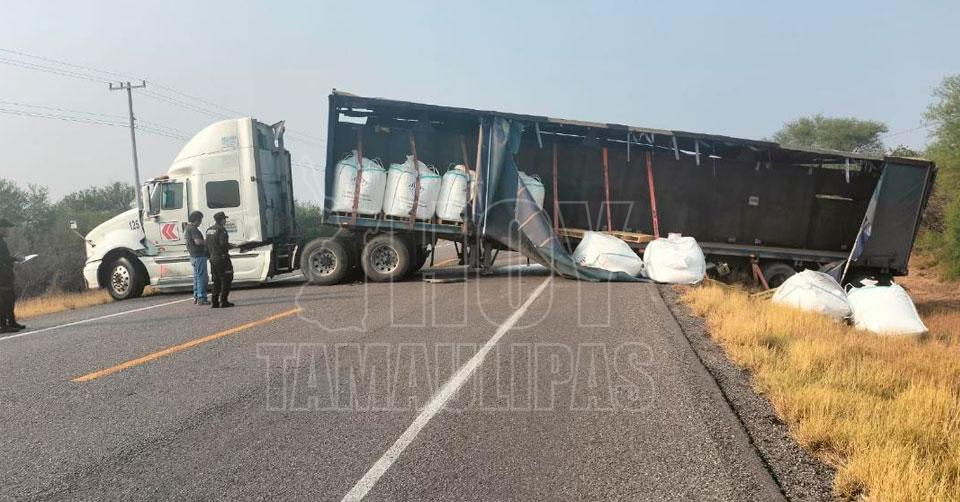 Trailero se descontrola y queda atravesado en la carretera Victoria-Matamoros