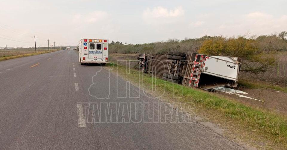 Vuelca tráiler cargado de impermeabilizantes en la carretera San Fernando-Matamoros