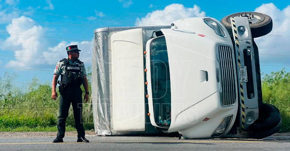 Vuelca camión en la carretera Matamoros-Reynosa; chofer sale ileso