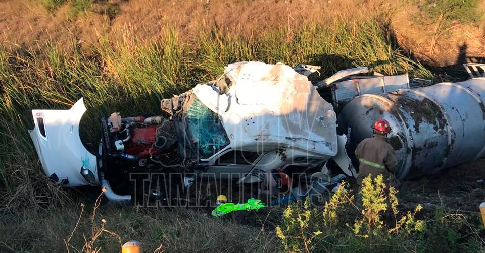 Vuelca pipa cargada de etanol tras choque en Matamoros