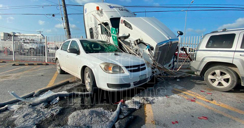Tráiler se mete a estacionamiento de maquiladora y choca dos vehículos en Matamoros