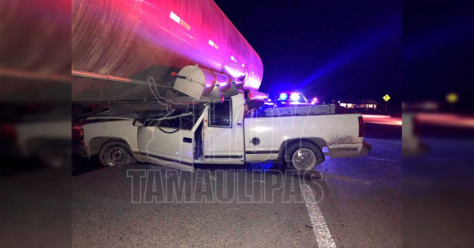 Camioneta termina debajo de pipa en Matamoros; tripulantes viven de milagro