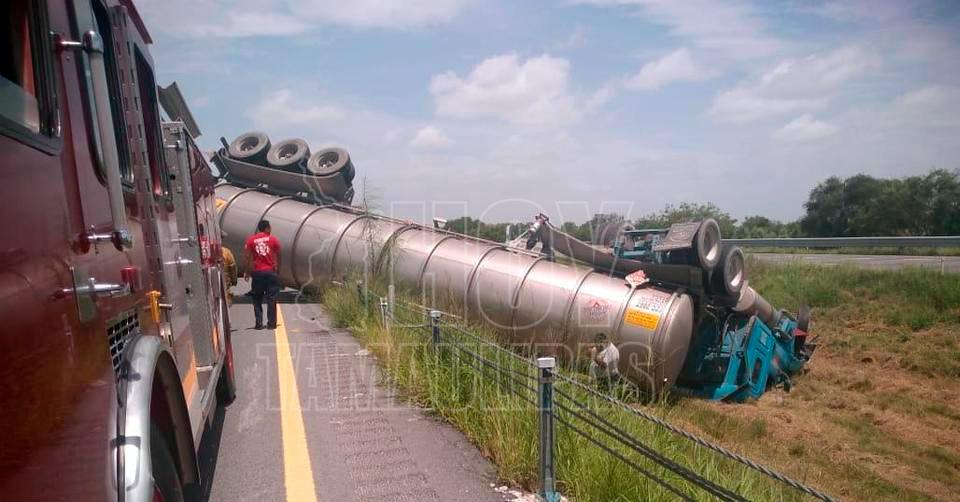 Vuelca pipa en Matamoros y chofer sale lesionado