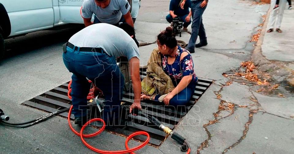 Jovencita queda atorada en una alcantarilla en Matamoros