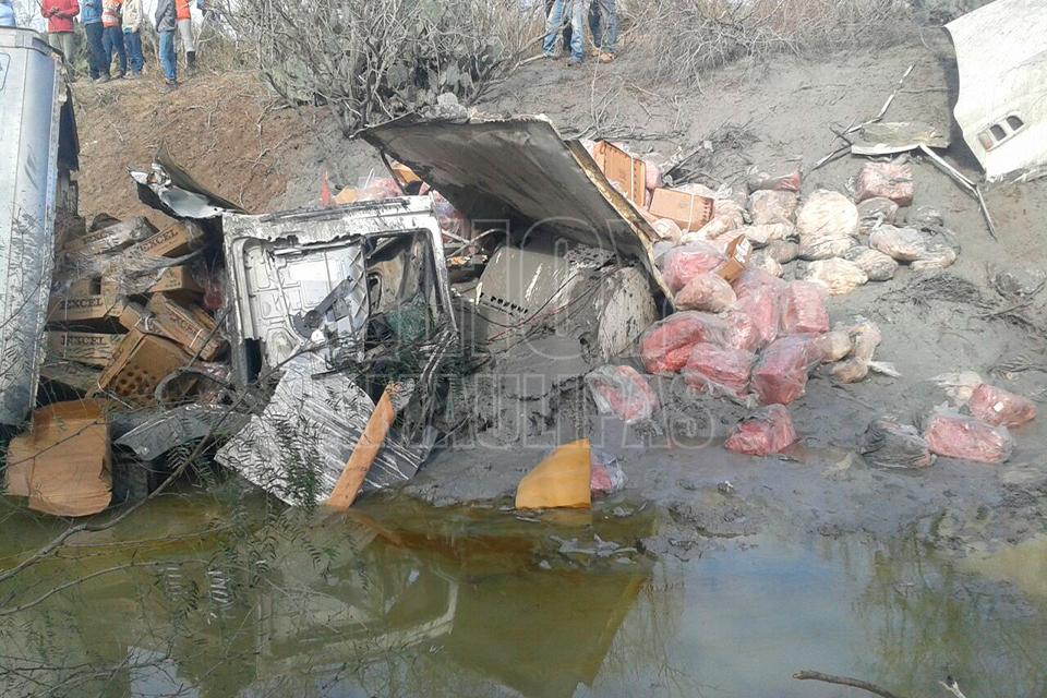 Se vuelca y cae a canal tráiler con toneladas de carne y pollo en Matamoros