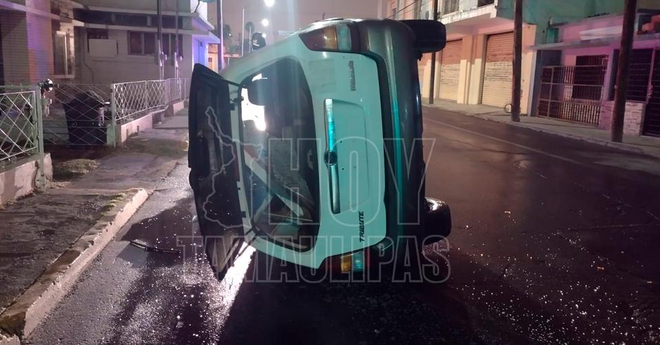 Choca contra camioneta estacionada y vuelca en Nuevo Laredo