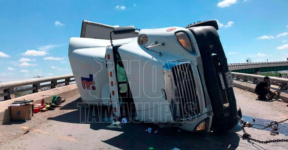 Trailero sale herido en volcadura en puente de Nuevo Laredo