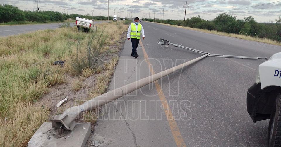 Vuelca al chocar y derribar poste de luz en Nuevo Laredo