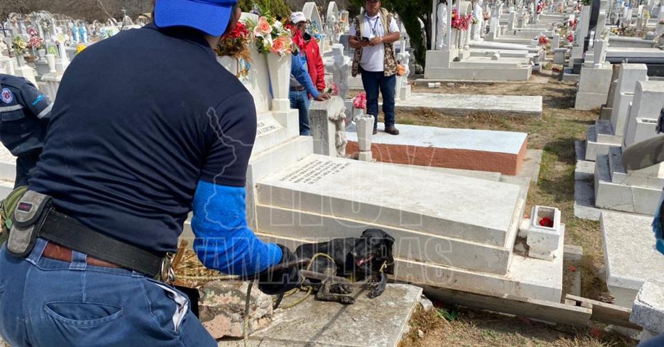 Rescatan a perro que cayó a fosa en panteón en Nuevo Laredo