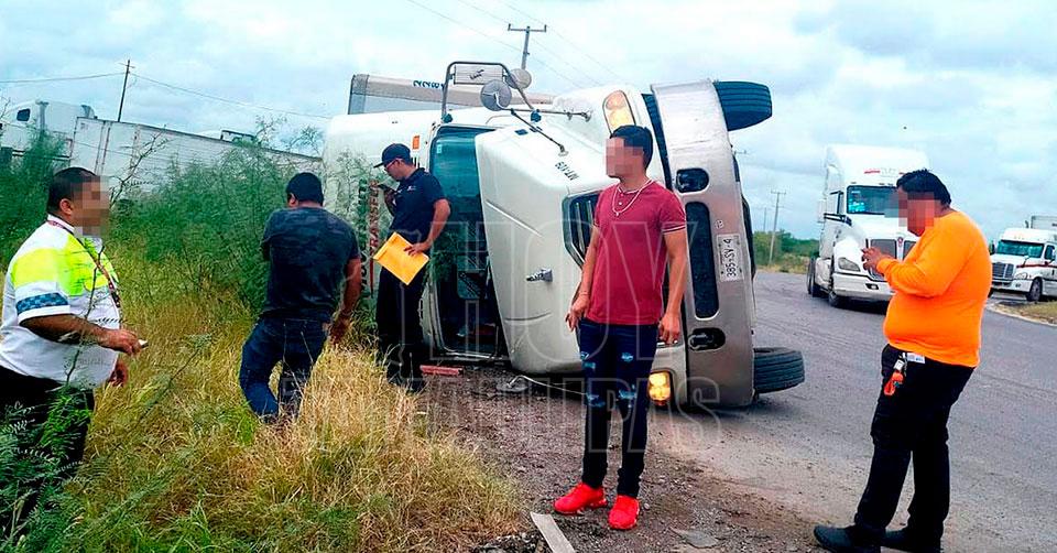 Trailero vuelca en Nuevo Laredo y sobrevive