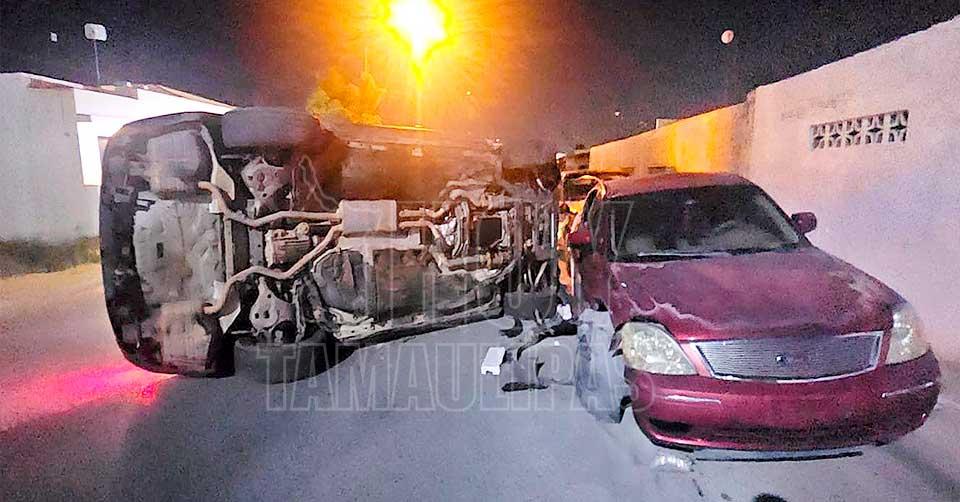 Ebrio vuelca tras chocar dos vehículos estacionados en Nuevo Laredo
