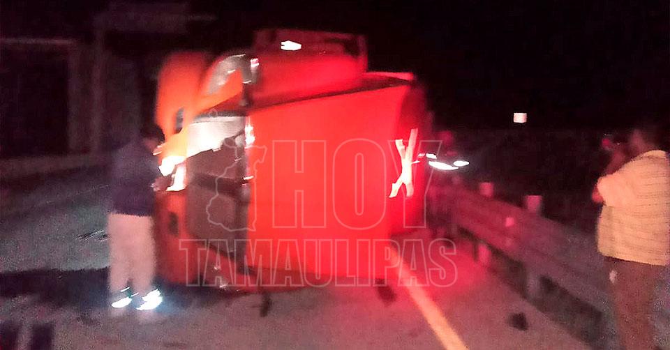 Trailero se salva tras volcadura en autopista cerca de Nuevo Laredo