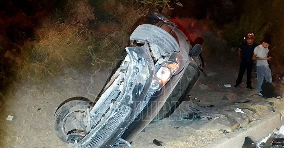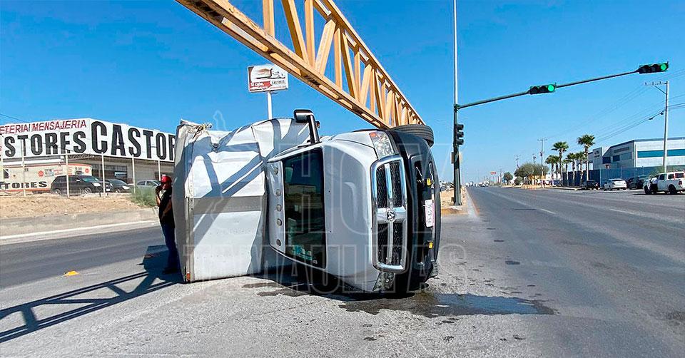 Choca contra barrera metálica y vuelca en Nuevo Laredo