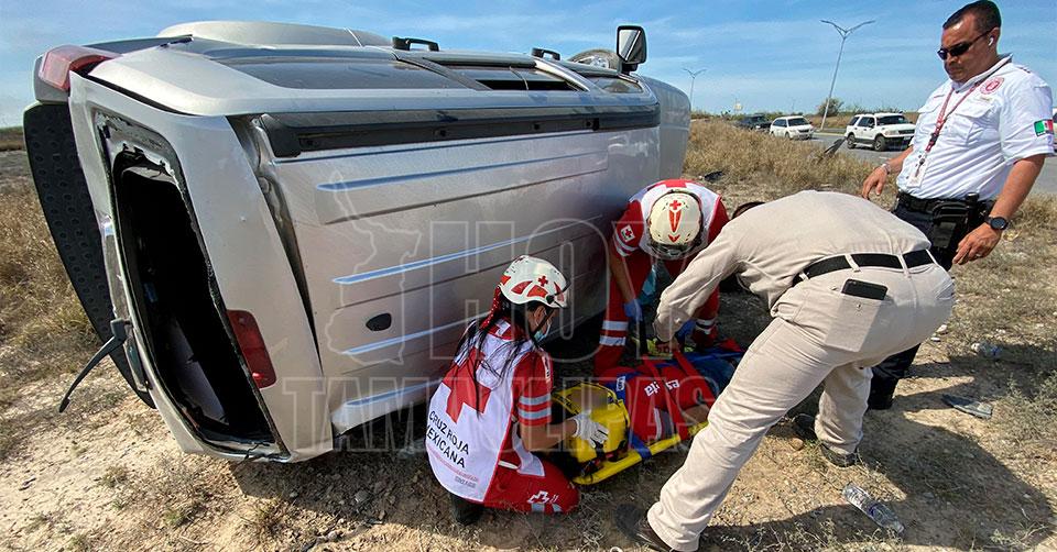 Mujer acaba herida en choque con volcadura en Nuevo Laredo