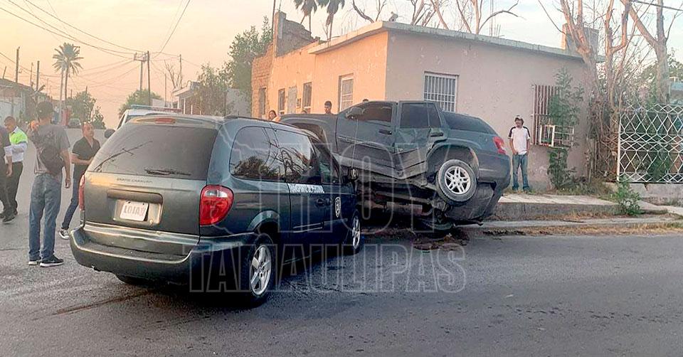 Camioneta queda trepada en otra tras choque en Nuevo Laredo