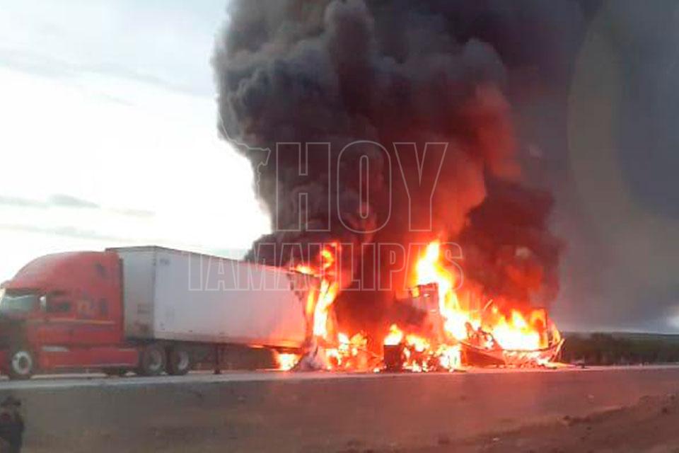 Estalla en llamas tráiler tras encontronazo cerca de Nuevo Laredo