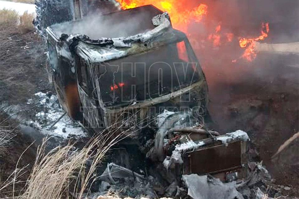 Tráiler queda convertido en chatarra al incendiarse en Nuevo Laredo
