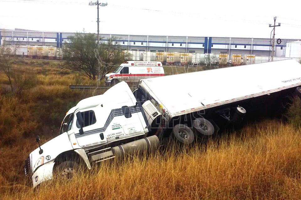 Trailero resulta ileso al volcar en Nuevo Laredo
