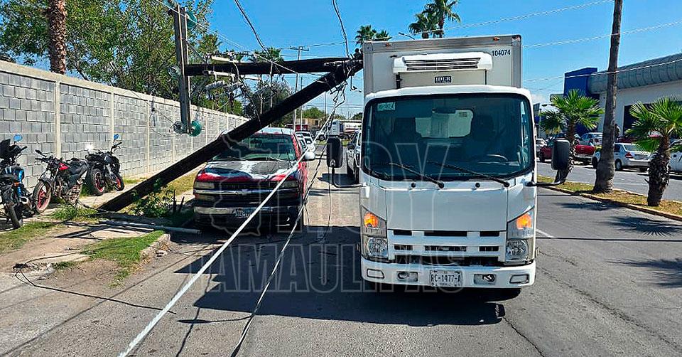 Tráiler derriba poste de CFE y cae encima de camioncito en Nuevo Laredo