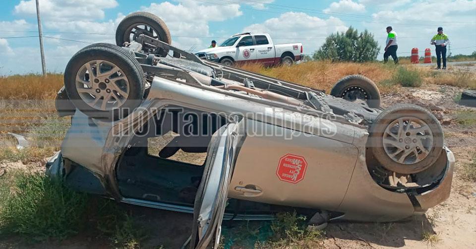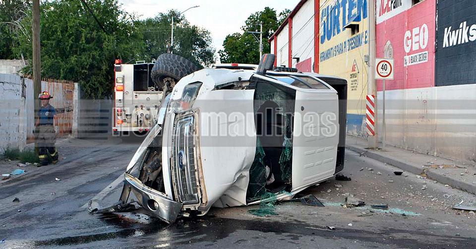 Vuelca pareja tras ser chocada por cafre en Nuevo Laredo