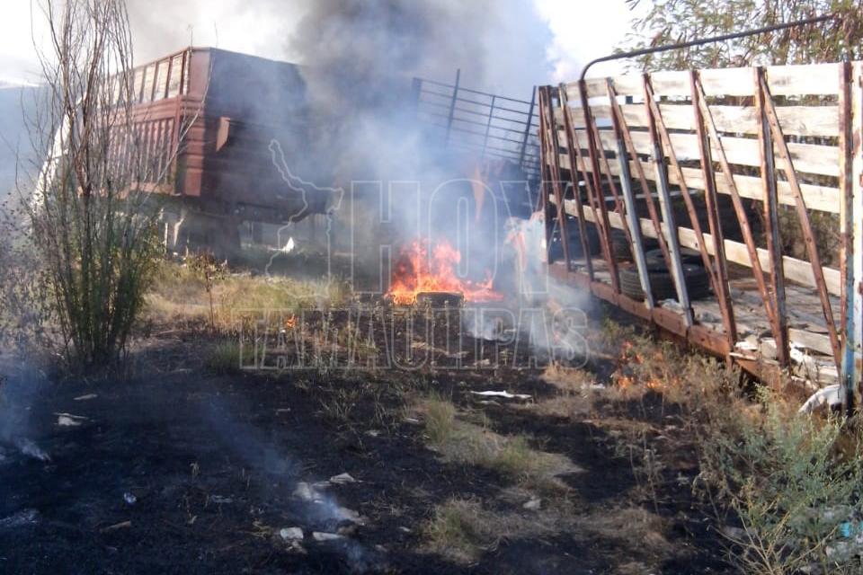 Fuego consume viejo camión en yonke de Nuevo Laredo