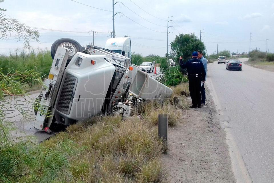 Trailero se salva de morir al volcar en Nuevo Laredo