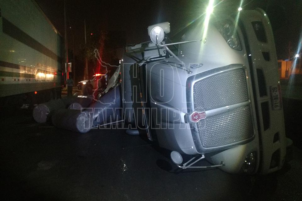 Vuelca tráiler cargado con mezclilla al sur de Nuevo Laredo