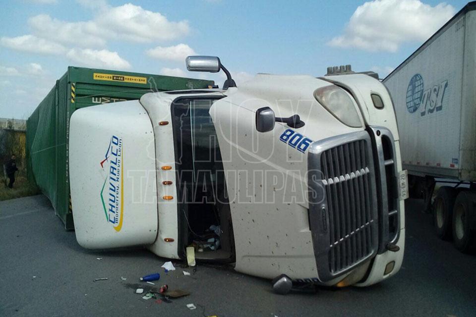 Se escapa de la muerte trailero al volcar al sur de Nuevo Laredo