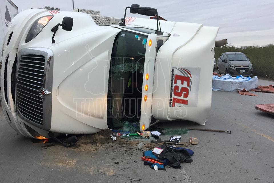 Vuelca tráiler con rollos de acero en Nuevo Laredo, un herido