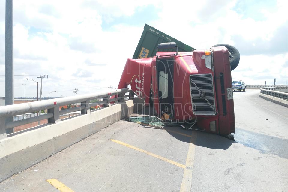 Trailer queda volcado en el puente de los “Aguacates” en Nuevo Laredo