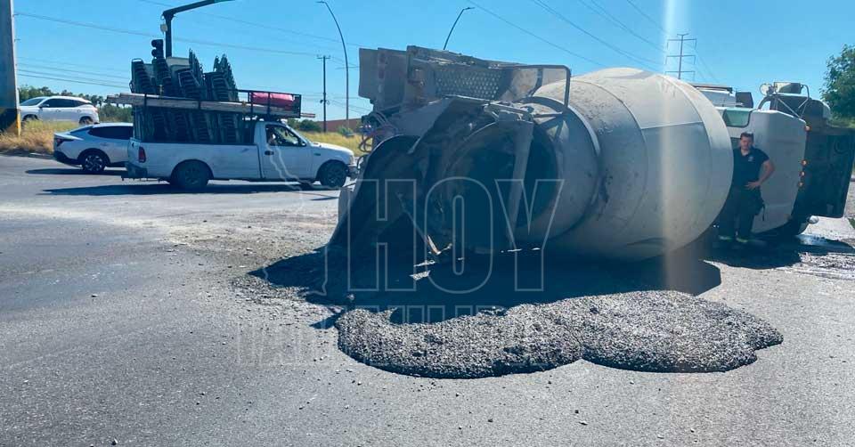 Vuelca camión revolvedor y derrama mezcla sobre libramiento en Reynosa