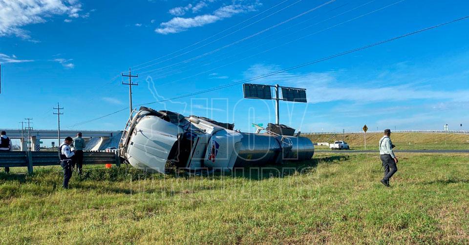 Vuelca pipa cargada con jugo en Reynosa