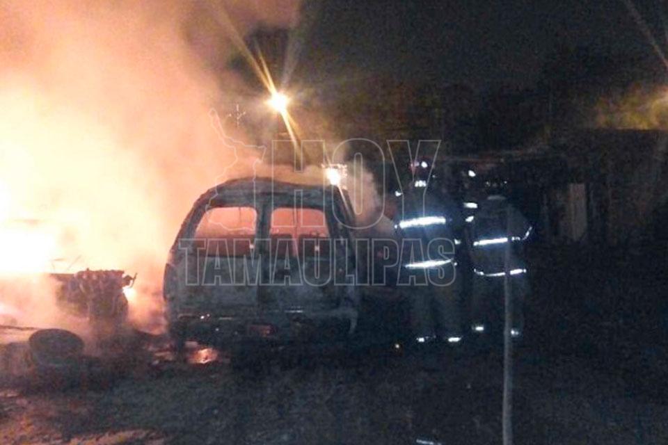 Fuego consume camioneta en taller mecánico de Reynosa
