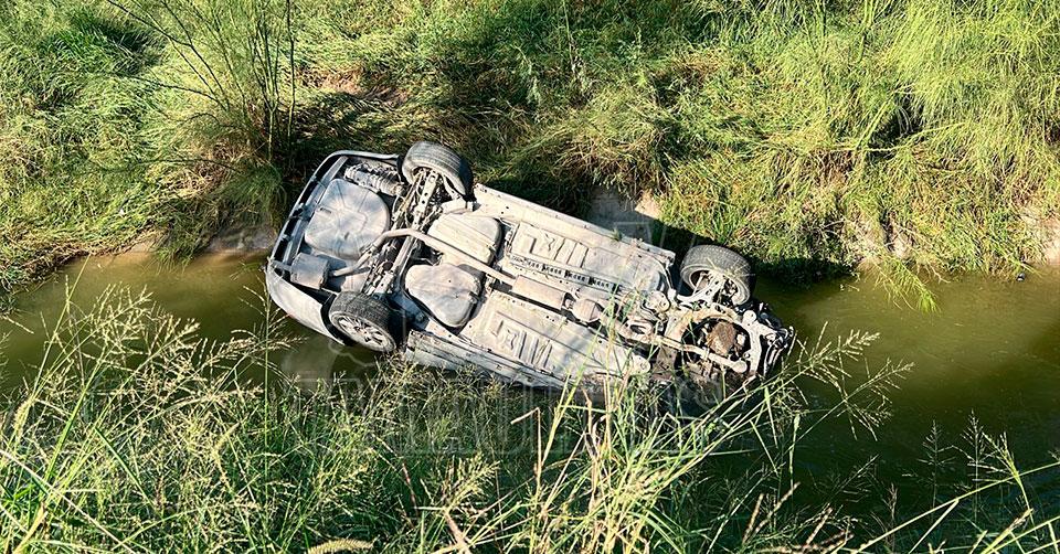 Conductor pierde el control y cae volcado a un canal de riego en Reynosa