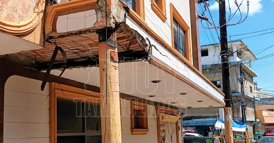 Cierran paso peatonal por desprendimientos de marquesina en Hotel de Tampico