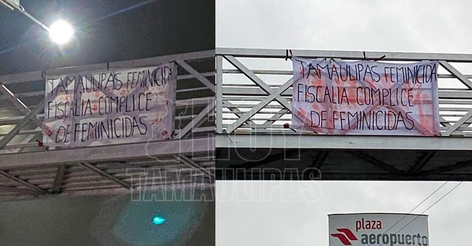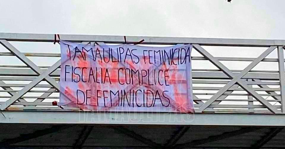 Feministas colocan manta en Puente de Tampico; estatales la quitan en minutos