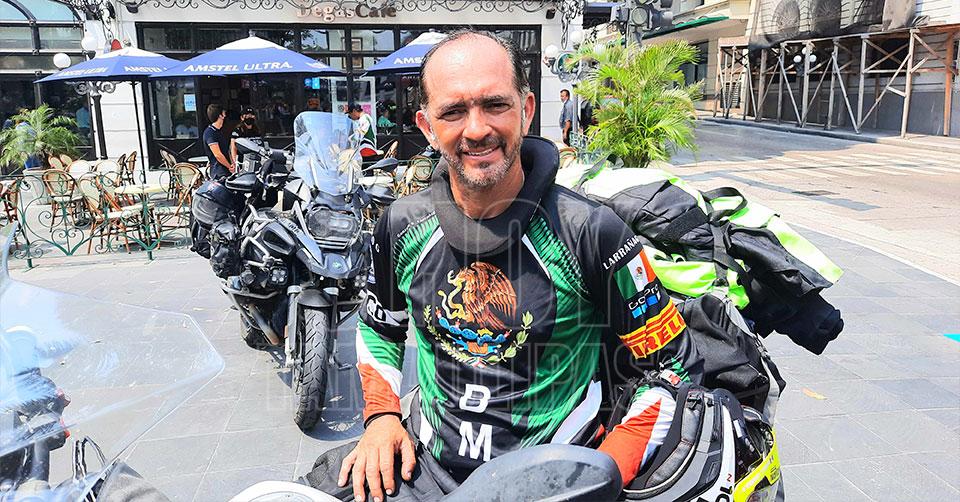 Motociclista mexicano aventurero en su paso por Tampico, quiere romper récord Guinness