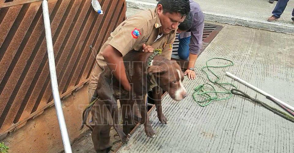 Rescatan Bomberos de Tampico mascota que se metió a dren pluvial