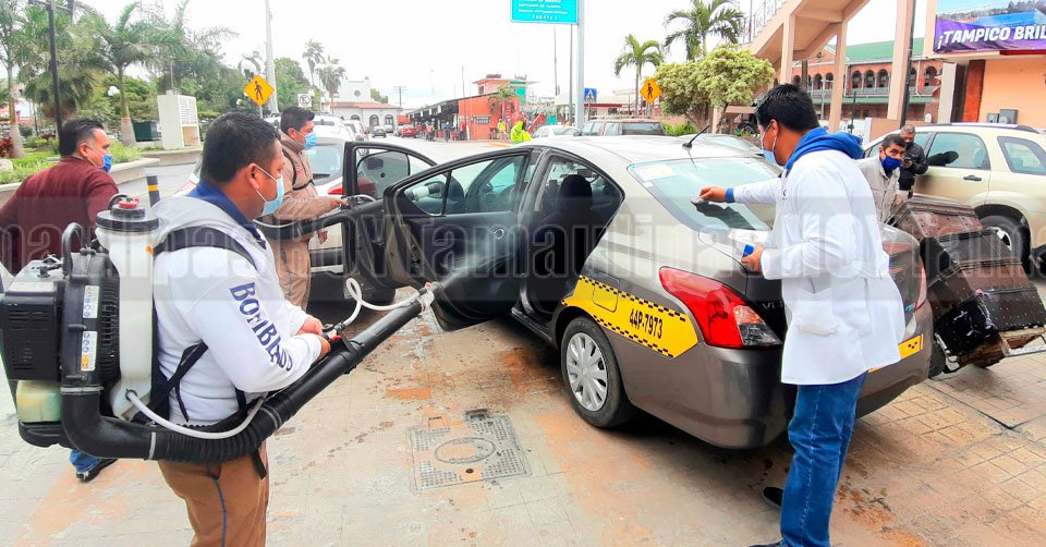 Desinfectan autos y negocios en el centro de Tampico