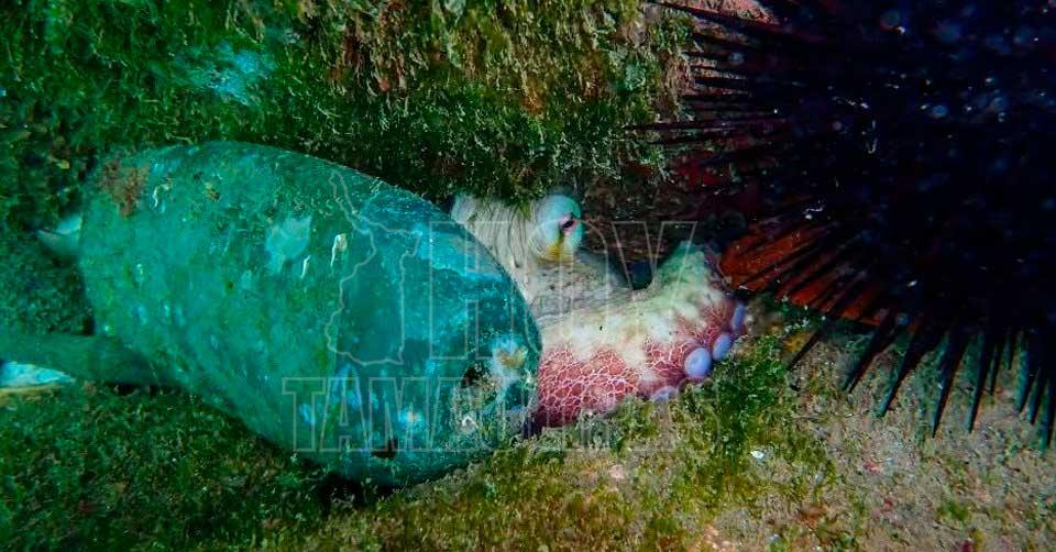 Pulpo usa botella de shampoo como refugio en Playa Miramar